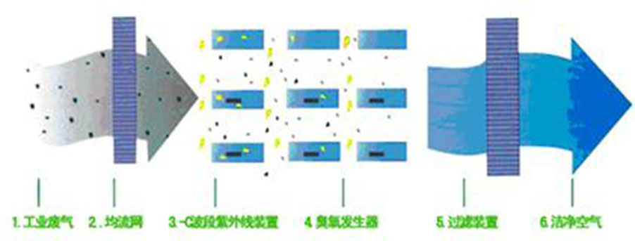3、惡臭氣體通過廢氣收集排風設(shè)備進入到裝有UV光解氧化模塊的反應腔后,高能UV紫外線光束及臭氧對惡臭氣體進行協(xié)同分解氧化反應,使惡臭氣體物質(zhì)降解轉(zhuǎn)化成低分子化合物、水和二氧化碳,再通過排風管道排出室外。