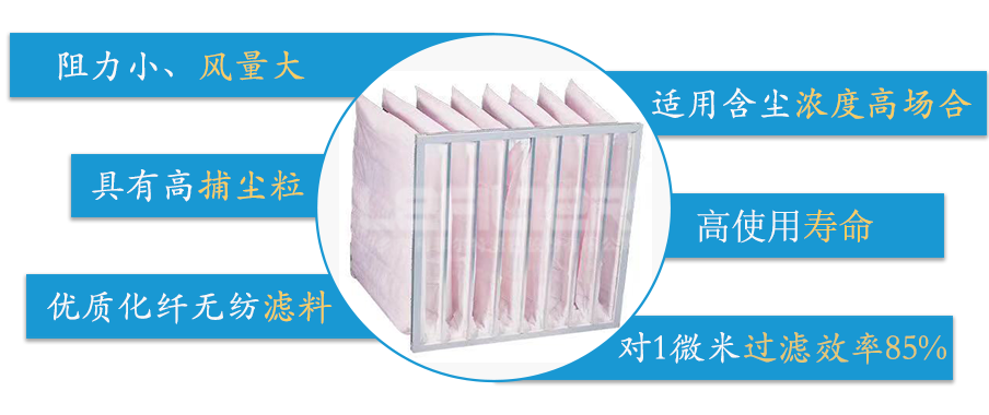 2,袋式中效過濾器濾料以極細(xì)致的特殊玻璃纖維制成,以無紡布強化,阻力低、高集塵效率