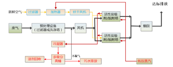 脫附過(guò)程:活性炭使用一段時(shí)間后處于飽和狀態(tài),此時(shí)需對(duì)活性炭進(jìn)行再生處理,脫附再生選用加溫解析法,將高溫蒸汽自塔底噴入罐內(nèi)將有機(jī)物從活性炭中剝離,
